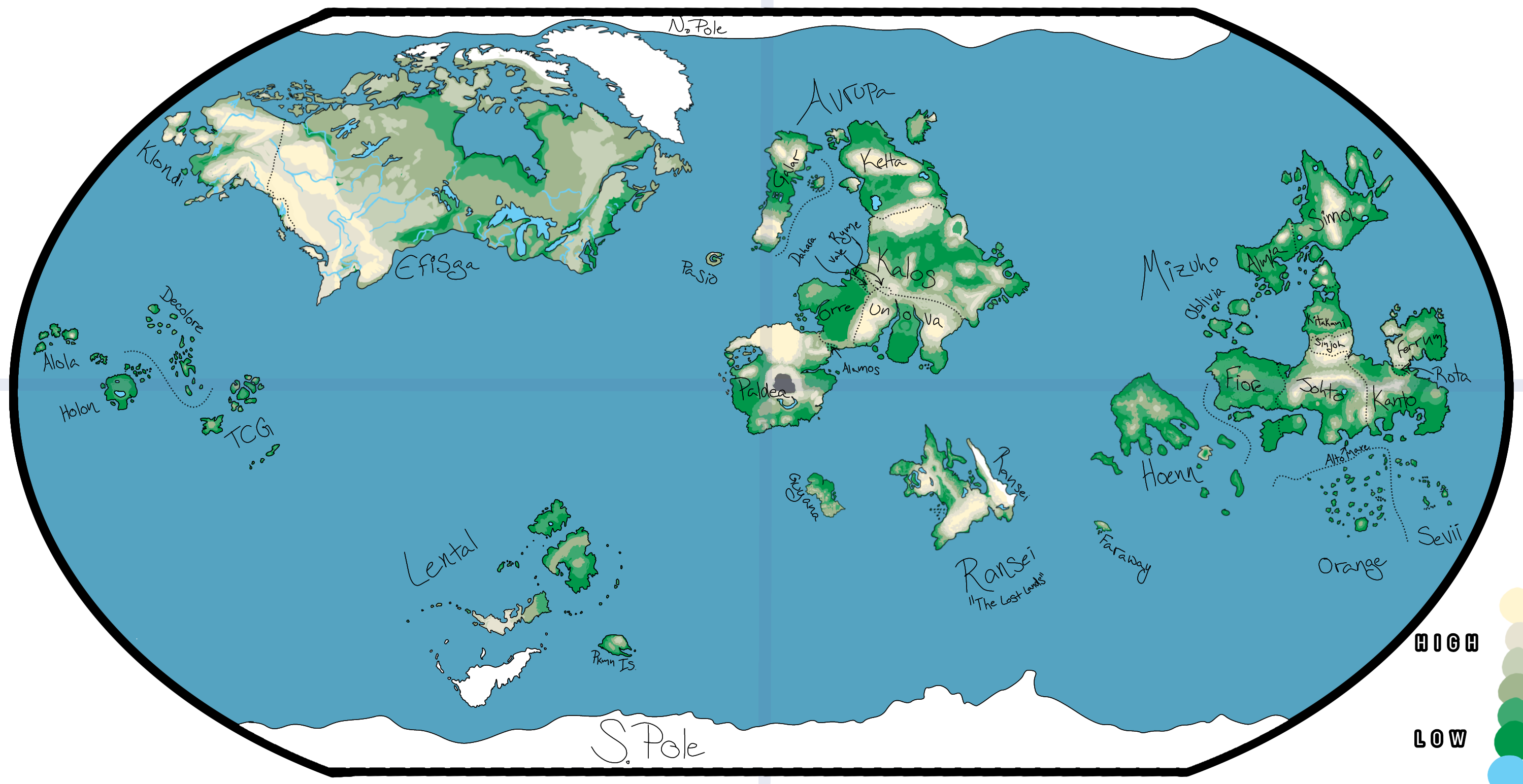 Decolore boasts a distinct Kalosian population blended with many Alolan and Holonian influences to make it uniquely its own. Lental, while the majority of its population is Pokémon, serves as a valuable research outpost on each of its islands and provides passage to the southern pole, where many researchers study Pokémon found in both areas.