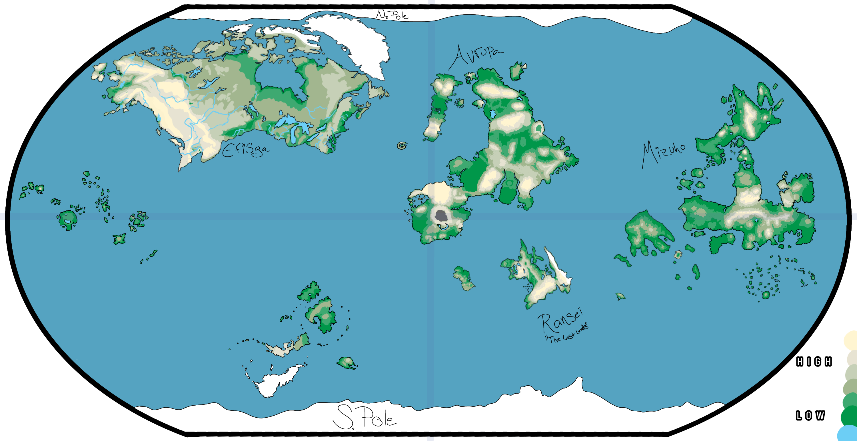 Efisga's 4 regions are united under one system, operating in harmony with each other. The names of the Efisgan regions, while distinct areas themselves, are primarily for specifying where one is from or living. Efisga remains the least populated of the major inhabited continents due to its mountainous western half and colder climates up north.